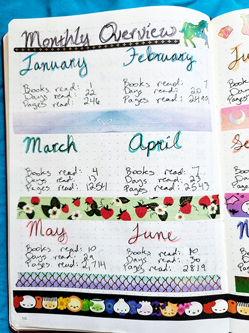And if you look at the monthly overview for the first six months, you’ll see that I’ve read more every month since I started tracking it in this journal. I get excited to write about each book as I finish it, and it’s nice to write down my thoughts while they’re fresh. Online, it can take me weeks or months to write a review, so I sometimes have trouble remembering what I thought of a book. This journal helps me capture the ideas sooner.